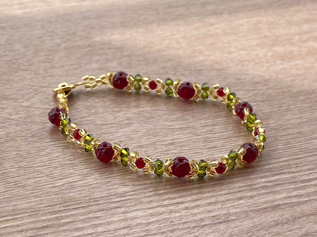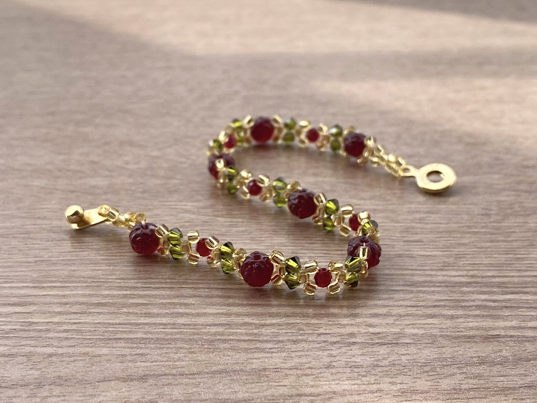 こちらのブレスレットは、バラの蕾を思わせる深い赤のヴィンテージビーズを主役に、ガーネットレッドとカーキグリーンのクリスタルビーズをあしらった、上品で女性らしいデザインです。ゴールドのビーズが、手元に華やかさを添えます。