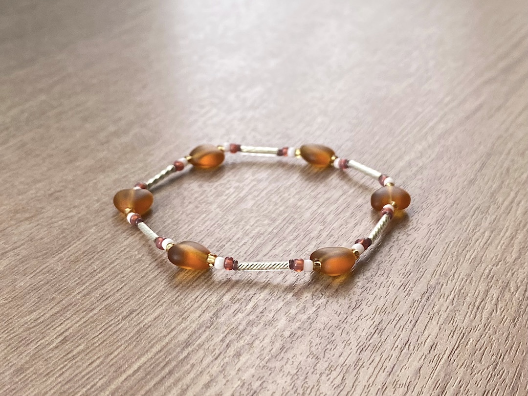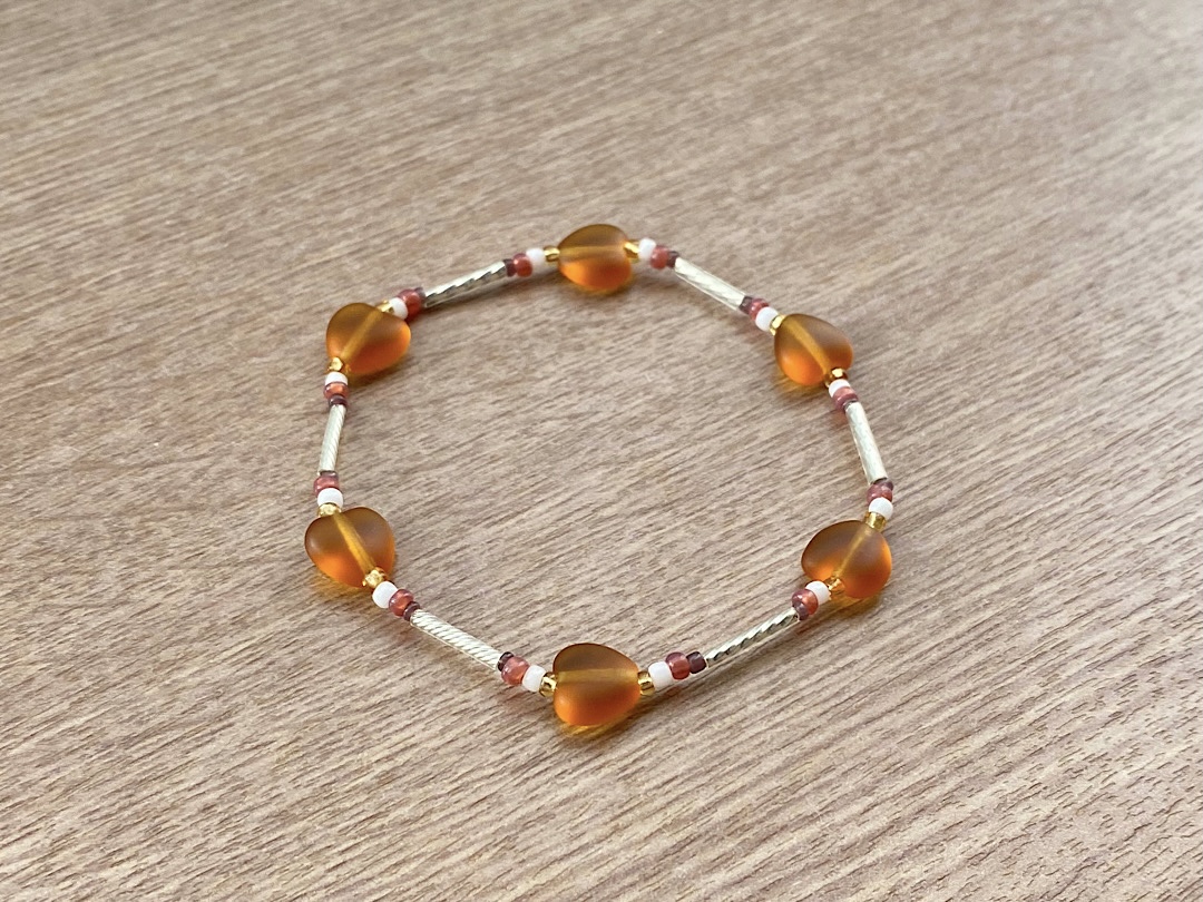キャラメルカラーのハート型ヴィンテージビーズをメインに、ホワイトシルバービーズを組み合わせたブレスレット。