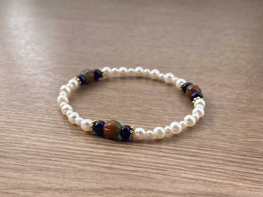ブラウンとグリーンのバイカラービーズに、深いネイビーのヴィンテージビーズを合わせたブレスレット。