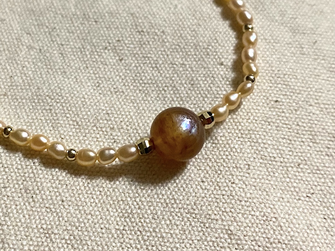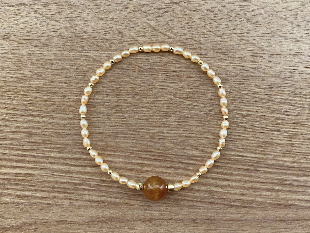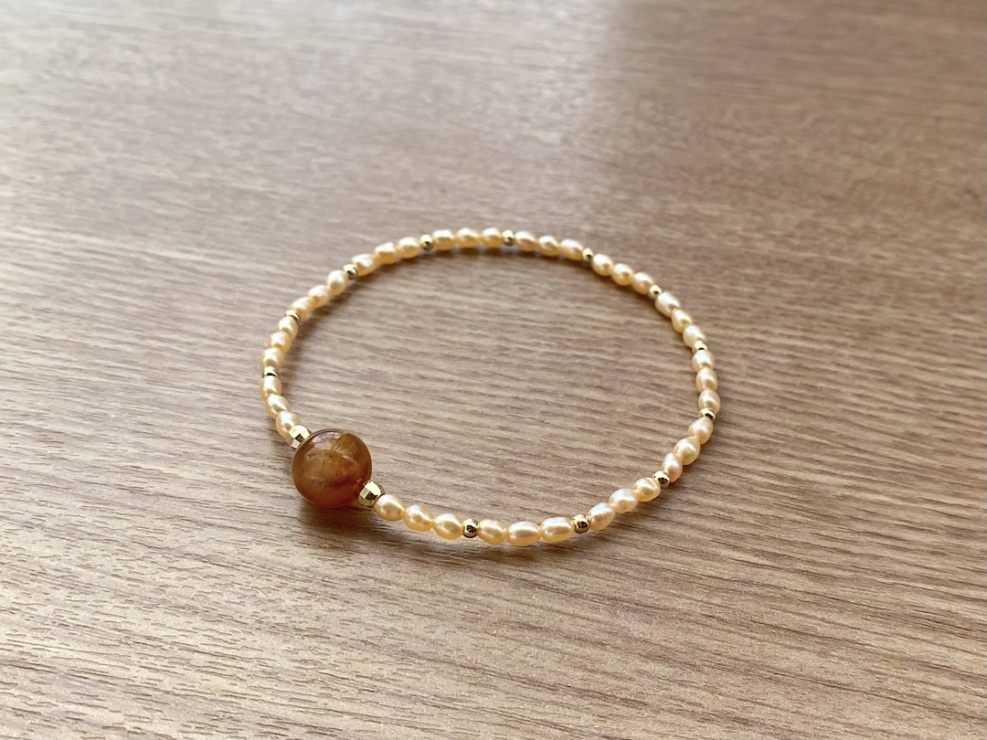 落ち着いた深みのあるミューテッドアンバーが秋の温かみと上品さを感じさせ、柔らかいオレンジカラーの淡水パールを組み合わせることで全体に統一感を持たせました。