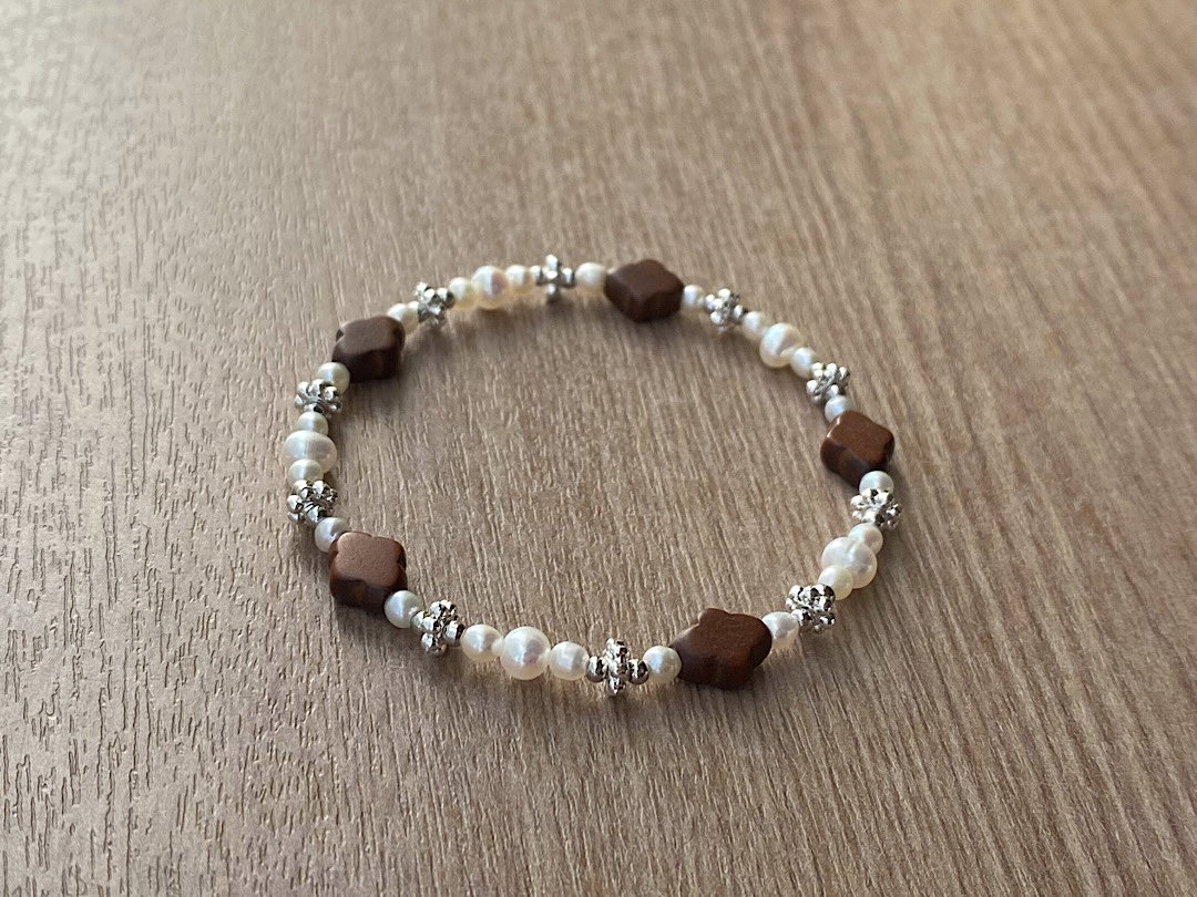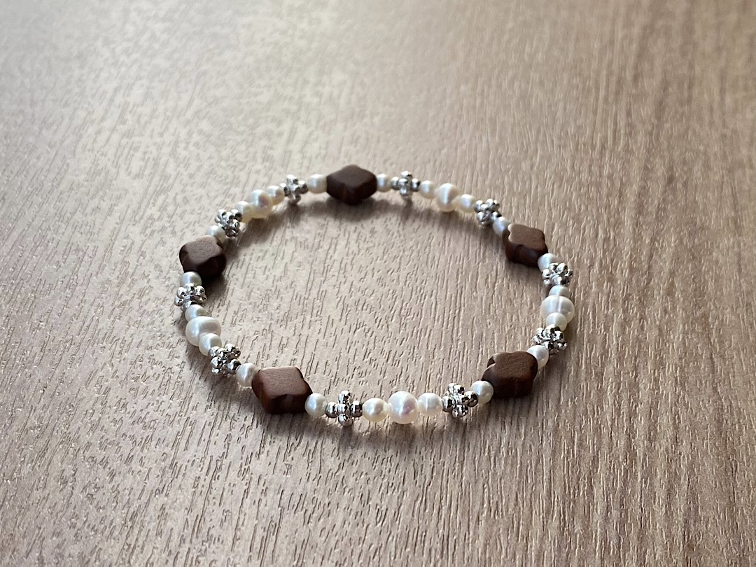 Material: vintage wooden beads, freshwater pearl beads, Silver Filled beads, stretch cord