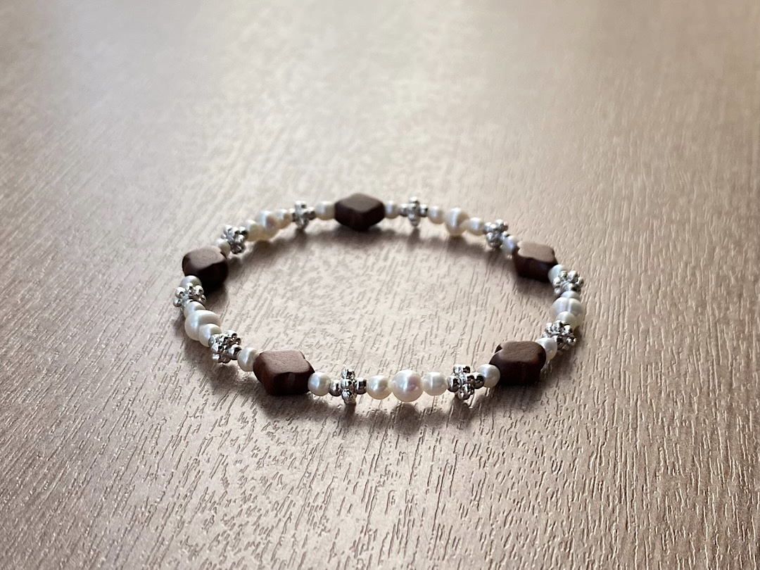 The warmth of the wood and the gentle luster of the pearls harmonize subtly, adding a delicate touch to your wrist.